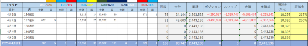 今週は、AUD/NZDを中心に、91件の約定 49,603円の利益となりました。過去2番目に大きいい利益です。証拠金維持率は250%台と若干持ち直しましたが、依然として厳しい状況は継続中。USD/CADがレンジ内にもどってきたのが救いです。