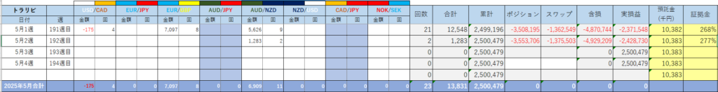 今週は、非常に動きが少なく、2件の約定 1,283円の利益となりました。証拠金維持率は277%台と依然として厳しい状況は継続中。ドル高は一服といった感じではありますが、傾NOK/SEKのレンジ外、ドルカナダも約定できずスワップを払い続ける状況です。
