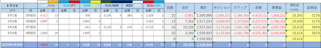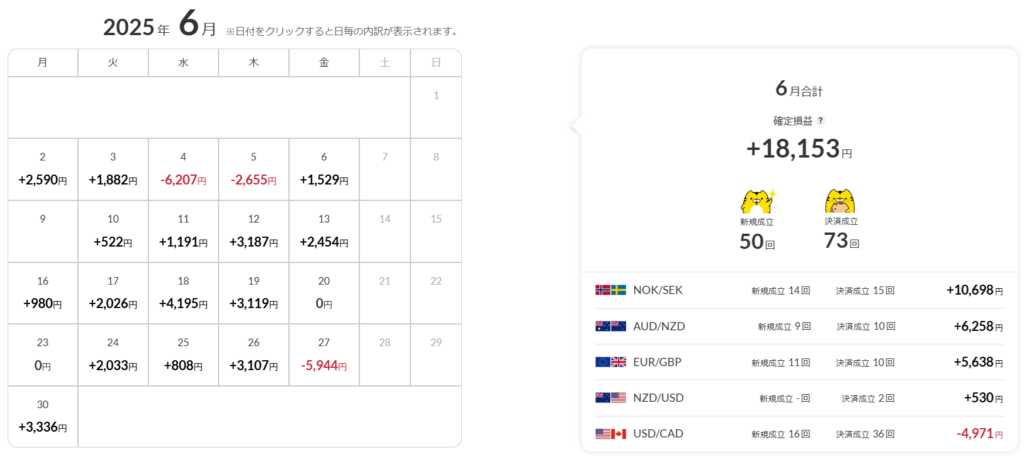 6月は前月の勢いを受け継ぐことができず、73件の約定18,153の利益となりました。