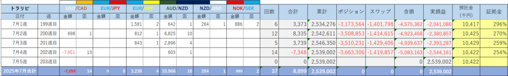 今週は、USD/CADのマイナス決済が多くありました。14件の約定 ▲7,348円の損失となりました。証拠金維持率は254%危険水域です。謎ユーロ高で含み損も増えています。本邦の利上げがなければさらなる円安になるかもしれません。