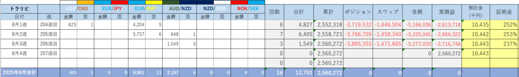 今週は、AUD/NZDに動きがあったものの、約定は進まず、3件の約定 1,549円の利益となりました。証拠金維持率は237%と改善は見られず危険水域のままです。ここは我慢が必要かと思っています。9月のFOMC後に損切を決行しようと思います。