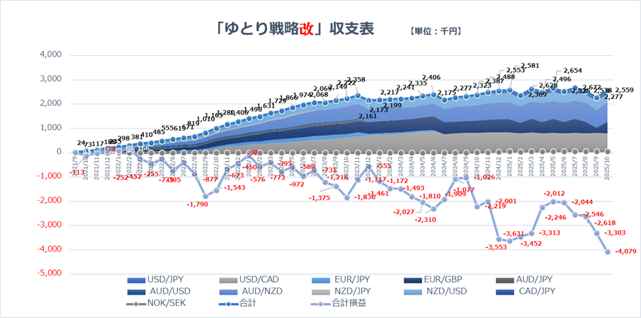 本戦略では、相場の上下は予想しません。なるべく同じ動きをしない、「相性の良いペア」を5通貨ペア運用し、「損益の極端な変動」を避けます。ここ数年は対円相場のスワップがきつく少々困っています(笑)
