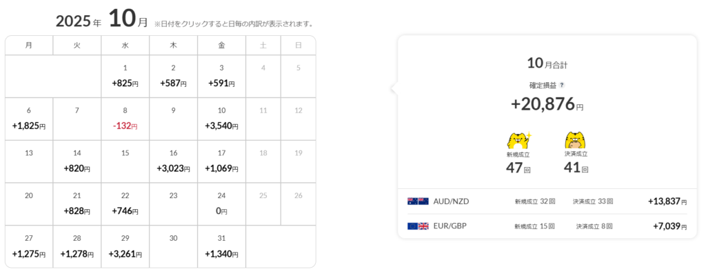 9月は総裁選を控えていたこともあり、為替は引き続き停滞となりました。今月は円安でどうしようなかったAUD/JPYを思い切って損切り、41件の約定20,876の利益となりました。