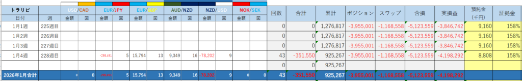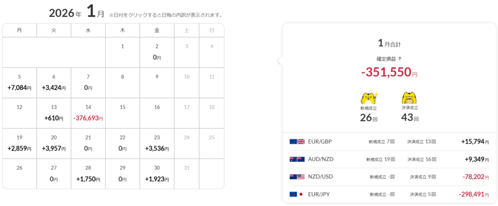 1月は高市総理の「責任ある積極的財政」によるドル高円安が続いています。また、月末には日米共同でのレートチェックが行われました。今月も損切を断行し43件の約定▲351,550円となりました。